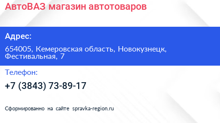 АвтоВАЗ, магазин автотоваров по адресу 654005, Кемеровская область, Новокузнецк, Фестивальная, 7 в дальнейшем Организация, размещена в следующих категориях: