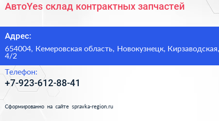 АвтоYes, склад контрактных запчастей по адресу 654004, Кемеровская область, Новокузнецк, Кирзаводская, 4/2 в дальнейшем Организация, размещена в следующих категориях: