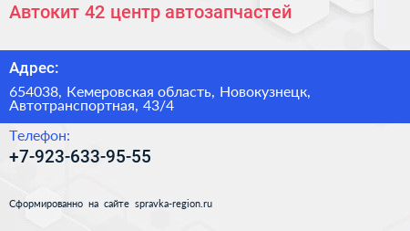 Автокит-42, центр автозапчастей по адресу 654038, Кемеровская область, Новокузнецк, Автотранспортная, 43/4 в дальнейшем Организация, размещена в следующих категориях:
