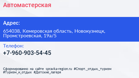 Автомастерская по адресу 654038, Кемеровская область, Новокузнецк, Промстроевская, 19а/5 в дальнейшем Организация, размещена в следующих категориях: