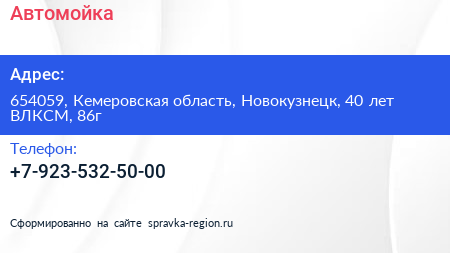 Автомойка по адресу 654059, Кемеровская область, Новокузнецк, 40 лет ВЛКСМ, 86г в дальнейшем Организация, размещена в следующих категориях:
