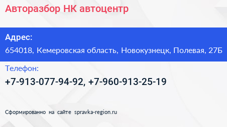 Авторазбор-НК, автоцентр по адресу 654018, Кемеровская область, Новокузнецк, Полевая, 27Б в дальнейшем Организация, размещена в следующих категориях: