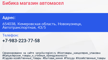 Бибика, магазин автомасел по адресу 654038, Кемеровская область, Новокузнецк, Автотранспортная, 43/5 в дальнейшем Организация, размещена в следующих категориях: