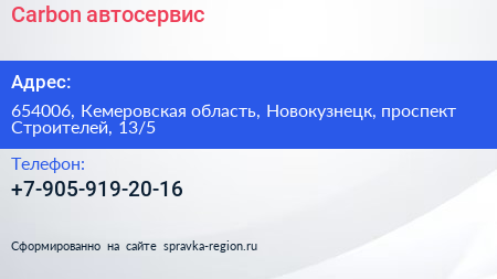 Carbon, автосервис по адресу 654006, Кемеровская область, Новокузнецк, проспект Строителей, 13/5 в дальнейшем Организация, размещена в следующих категориях: