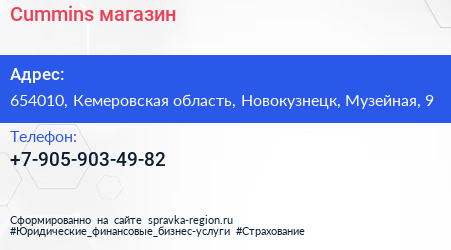 Cummins, магазин по адресу 654010, Кемеровская область, Новокузнецк, Музейная, 9 в дальнейшем Организация, размещена в следующих категориях: