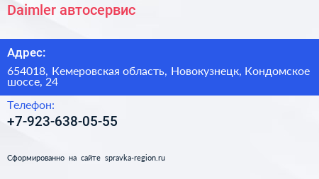 Daimler, автосервис по адресу 654018, Кемеровская область, Новокузнецк, Кондомское шоссе, 24 в дальнейшем Организация, размещена в следующих категориях: