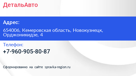 ДетальАвто по адресу 654006, Кемеровская область, Новокузнецк, Орджоникидзе, 4 в дальнейшем Организация, размещена в следующих категориях:
