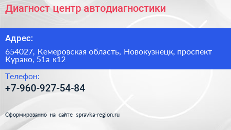 Диагност, центр автодиагностики по адресу 654027, Кемеровская область, Новокузнецк, проспект Курако, 51а к12 в дальнейшем Организация, размещена в следующих категориях: