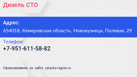 Дизель, СТО по адресу 654018, Кемеровская область, Новокузнецк, Полевая, 29 в дальнейшем Организация, размещена в следующих категориях: