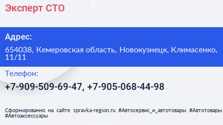 Эксперт, СТО по адресу 654038, Кемеровская область, Новокузнецк, Климасенко, 11/11 в дальнейшем Организация, размещена в следующих категориях: