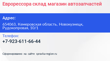 Еврорессора, склад-магазин автозапчастей по адресу 654063, Кемеровская область, Новокузнецк, Рудокопровая, 10/1 в дальнейшем Организация, размещена в следующих категориях: