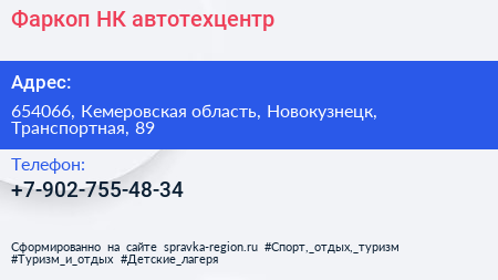 Фаркоп-НК, автотехцентр по адресу 654066, Кемеровская область, Новокузнецк, Транспортная, 89 в дальнейшем Организация, размещена в следующих категориях: