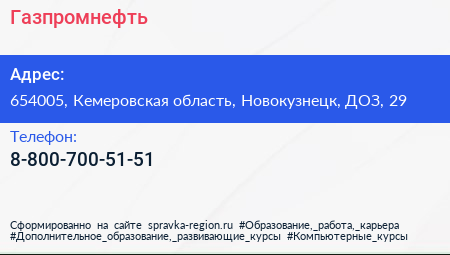 Газпромнефть по адресу 654005, Кемеровская область, Новокузнецк, ДОЗ, 29 в дальнейшем Организация, размещена в следующих категориях: