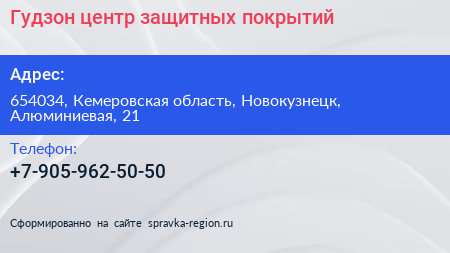 Гудзон, центр защитных покрытий по адресу 654034, Кемеровская область, Новокузнецк, Алюминиевая, 21 в дальнейшем Организация, размещена в следующих категориях:
