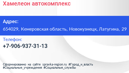 Хамелеон, автокомплекс по адресу 654029, Кемеровская область, Новокузнецк, Латугина, 29 в дальнейшем Организация, размещена в следующих категориях: