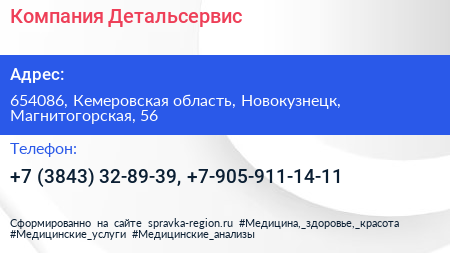 Компания Детальсервис по адресу 654086, Кемеровская область, Новокузнецк, Магнитогорская, 56 в дальнейшем Организация, размещена в следующих категориях: