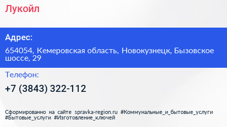 Лукойл по адресу 654054, Кемеровская область, Новокузнецк, Бызовское шоссе, 29 в дальнейшем Организация, размещена в следующих категориях: