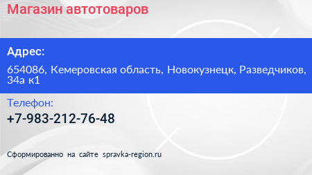 Магазин автотоваров по адресу 654086, Кемеровская область, Новокузнецк, Разведчиков, 34а к1 в дальнейшем Организация, размещена в следующих категориях: