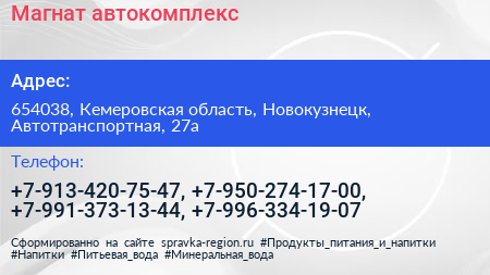 Магнат, автокомплекс по адресу 654038, Кемеровская область, Новокузнецк, Автотранспортная, 27а в дальнейшем Организация, размещена в следующих категориях: