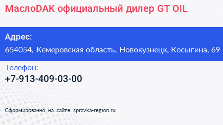 MаслоDAK, официальный дилер GT OIL по адресу 654054, Кемеровская область, Новокузнецк, Косыгина, 69 в дальнейшем Организация, размещена в следующих категориях: