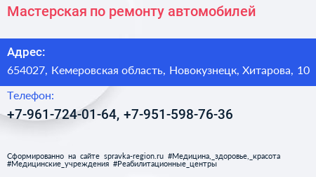 Мастерская по ремонту автомобилей по адресу 654027, Кемеровская область, Новокузнецк, Хитарова, 10 в дальнейшем Организация, размещена в следующих категориях: