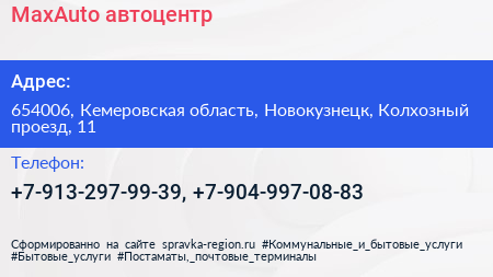 MaxAuto, автоцентр по адресу 654006, Кемеровская область, Новокузнецк, Колхозный проезд, 11 в дальнейшем Организация, размещена в следующих категориях: