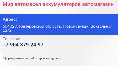 Мир автомасел & аккумуляторов, автомагазин по адресу 654029, Кемеровская область, Новокузнецк, Вокзальная, 12/2 в дальнейшем Организация, размещена в следующих категориях: