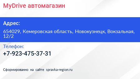 MyDrive, автомагазин по адресу 654029, Кемеровская область, Новокузнецк, Вокзальная, 12/2 в дальнейшем Организация, размещена в следующих категориях: