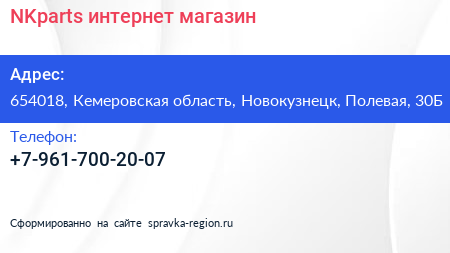 NKparts, интернет-магазин по адресу 654018, Кемеровская область, Новокузнецк, Полевая, 30Б в дальнейшем Организация, размещена в следующих категориях: