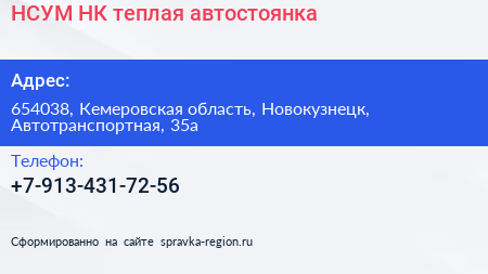 НСУМ-НК, теплая автостоянка по адресу 654038, Кемеровская область, Новокузнецк, Автотранспортная, 35а в дальнейшем Организация, размещена в следующих категориях: