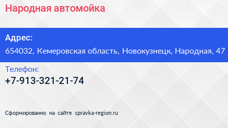 Народная, автомойка по адресу 654032, Кемеровская область, Новокузнецк, Народная, 47 в дальнейшем Организация, размещена в следующих категориях: