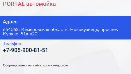 PORTAL, автомойка по адресу 654063, Кемеровская область, Новокузнецк, проспект Курако, 51а к20 в дальнейшем Организация, размещена в следующих категориях: