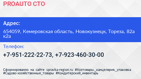 PROAUTO, СТО по адресу 654059, Кемеровская область, Новокузнецк, Тореза, 82а к2а в дальнейшем Организация, размещена в следующих категориях: