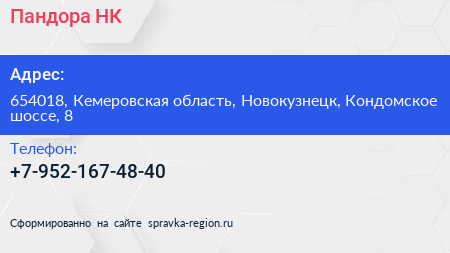 Пандора-НК по адресу 654018, Кемеровская область, Новокузнецк, Кондомское шоссе, 8 в дальнейшем Организация, размещена в следующих категориях: