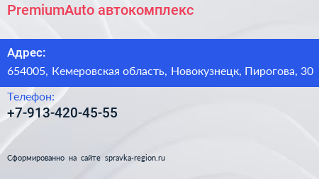 PremiumAuto, автокомплекс по адресу 654005, Кемеровская область, Новокузнецк, Пирогова, 30 в дальнейшем Организация, размещена в следующих категориях: