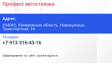 Прогресс, автостоянка по адресу 654041, Кемеровская область, Новокузнецк, Транспортная, 14 в дальнейшем Организация, размещена в следующих категориях: