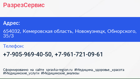 РазрезСервис по адресу 654032, Кемеровская область, Новокузнецк, Обнорского, 35/3 в дальнейшем Организация, размещена в следующих категориях: