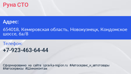 Руна, СТО по адресу 654018, Кемеровская область, Новокузнецк, Кондомское шоссе, 6а/8 в дальнейшем Организация, размещена в следующих категориях: