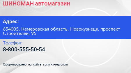ШИНОМАН, автомагазин по адресу 654005, Кемеровская область, Новокузнецк, проспект Строителей, 95 в дальнейшем Организация, размещена в следующих категориях:
