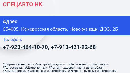 СПЕЦАВТО-НК по адресу 654005, Кемеровская область, Новокузнецк, ДОЗ, 2Б в дальнейшем Организация, размещена в следующих категориях: