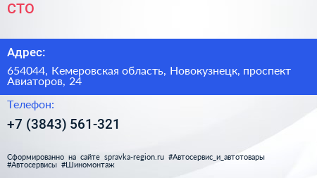 СТО по адресу 654044, Кемеровская область, Новокузнецк, проспект Авиаторов, 24 в дальнейшем Организация, размещена в следующих категориях: