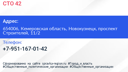 СТО 42 по адресу 654006, Кемеровская область, Новокузнецк, проспект Строителей, 11/2 в дальнейшем Организация, размещена в следующих категориях:
