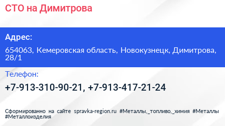 СТО на Димитрова по адресу 654063, Кемеровская область, Новокузнецк, Димитрова, 28/1 в дальнейшем Организация, размещена в следующих категориях: