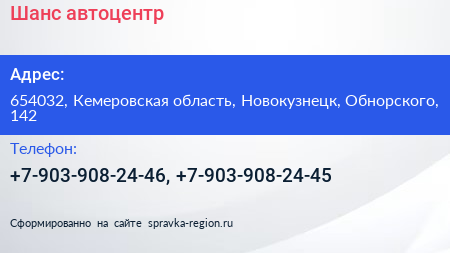Шанс, автоцентр по адресу 654032, Кемеровская область, Новокузнецк, Обнорского, 142 в дальнейшем Организация, размещена в следующих категориях:
