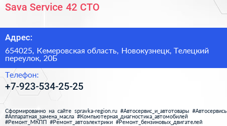 Sava Service 42, СТО по адресу 654025, Кемеровская область, Новокузнецк, Телецкий переулок, 20Б в дальнейшем Организация, размещена в следующих категориях: