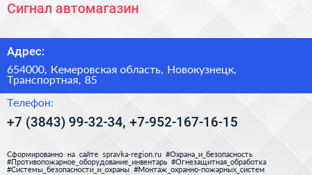 Сигнал, автомагазин по адресу 654000, Кемеровская область, Новокузнецк, Транспортная, 85 в дальнейшем Организация, размещена в следующих категориях: