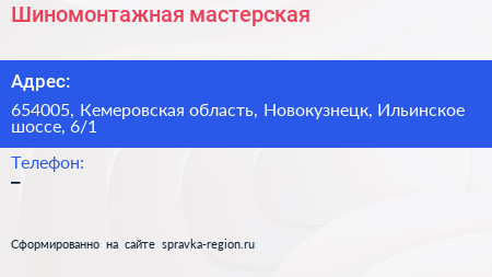 Шиномонтажная мастерская по адресу 654005, Кемеровская область, Новокузнецк, Ильинское шоссе, 6/1 в дальнейшем Организация, размещена в следующих категориях: