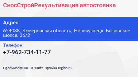 СносСтройРекультивация, автостоянка по адресу 654038, Кемеровская область, Новокузнецк, Бызовское шоссе, 36/2 в дальнейшем Организация, размещена в следующих категориях:
