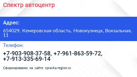 Спектр, автоцентр по адресу 654029, Кемеровская область, Новокузнецк, Вокзальная, 11 в дальнейшем Организация, размещена в следующих категориях: