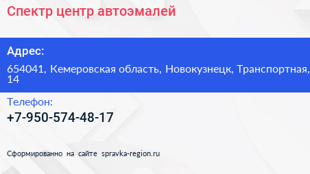 Спектр, центр автоэмалей по адресу 654041, Кемеровская область, Новокузнецк, Транспортная, 14 в дальнейшем Организация, размещена в следующих категориях: